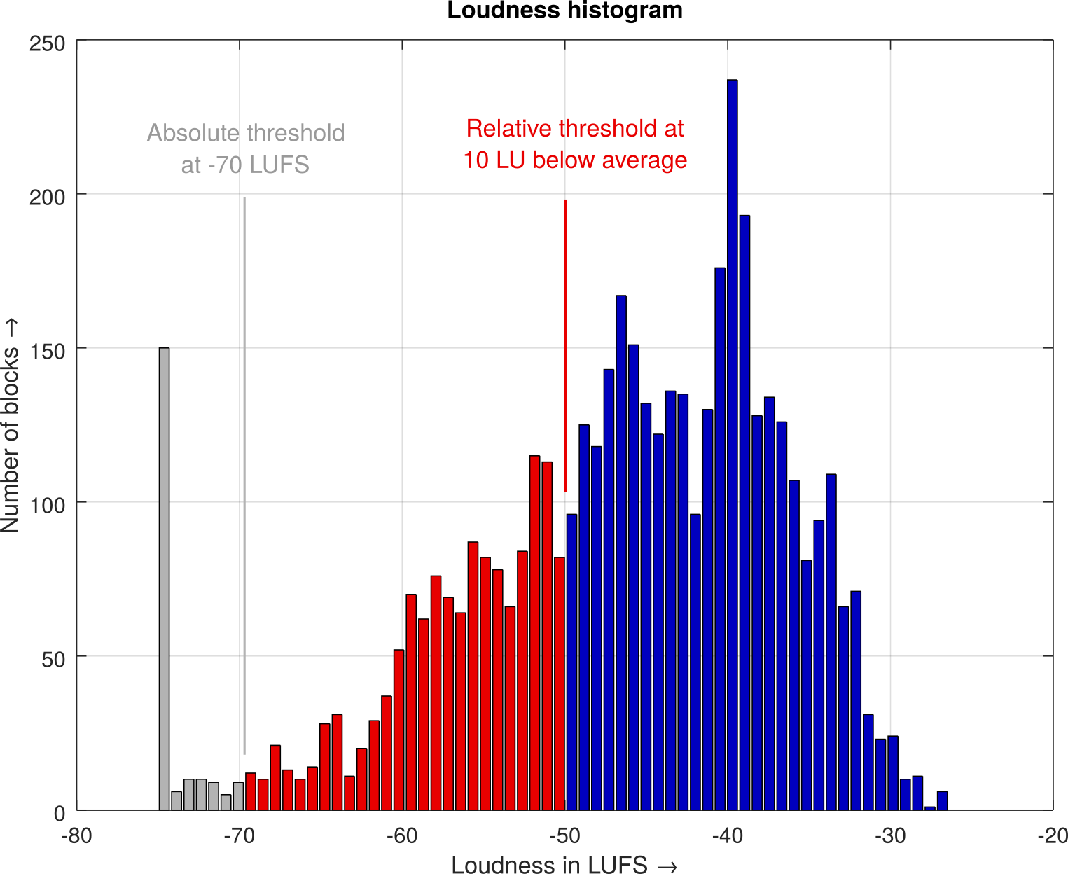 Since the perceived loudness is mostly determined by the louder parts of a track, an accurate loudness measurement has to ignore quier or even silent parts. This is realized by loudness gating. First, loudness gating as defined by EBU R 128 discards all measurement blocks that are below an absolute threshold of -70 LUFS (grey in the example histogram, the large peak in the lowest bin is caused by silence at the start and end of the track). In the next step, a relative threshold is calculated 10 LU below the average of the blocks above -70 LUFS (red in the example histogram). All blocks below that relative threshold are discarded as well. Finally, the perceived loudness is calculated as the average of the remaining blocks (blue in the example histogram).